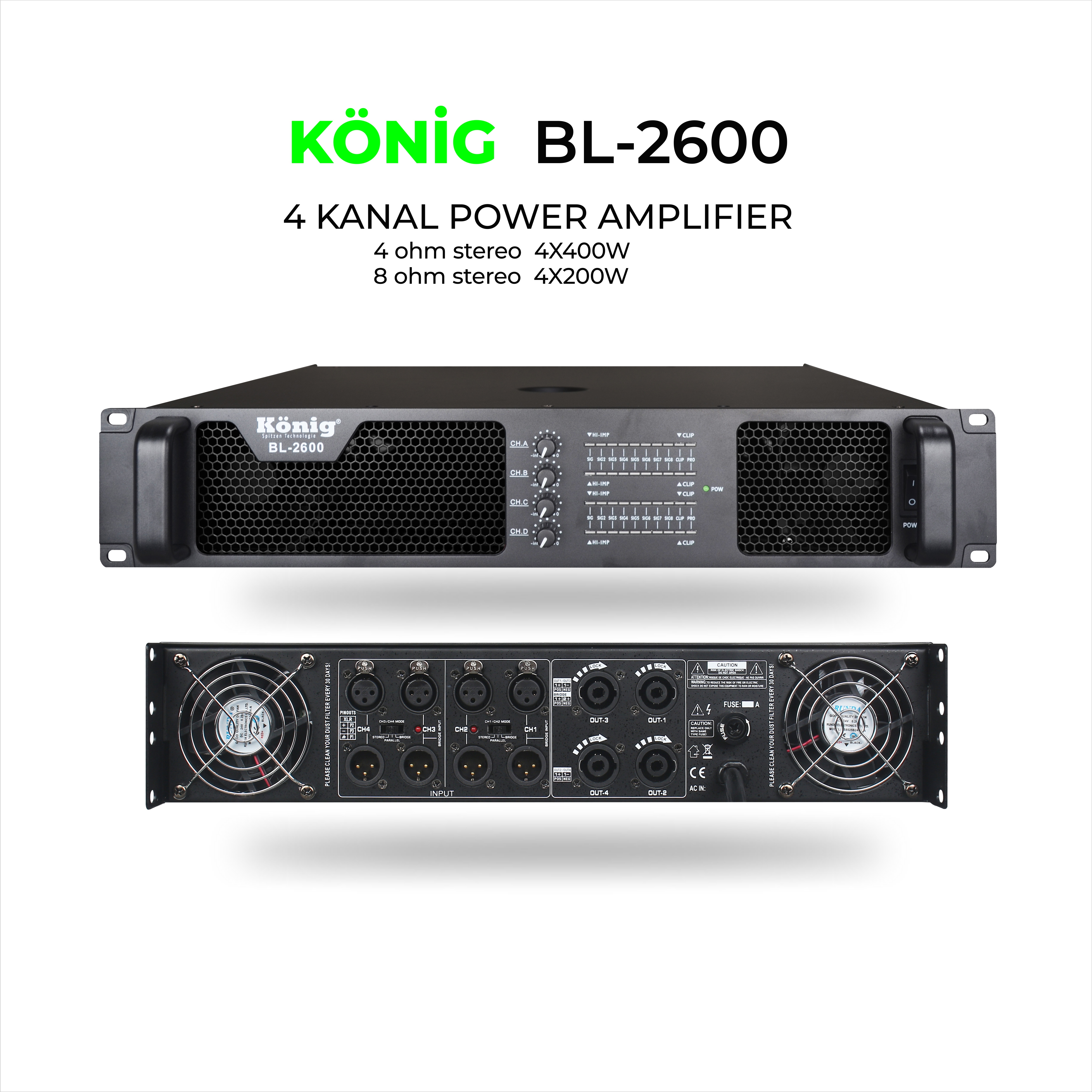 1600Watt 4Kanal Power Amplifikatör 4 Ohm 4 x 400W 8 Ohm 4 x 200W Frekans Tepkisi : 50Hz-220Hz