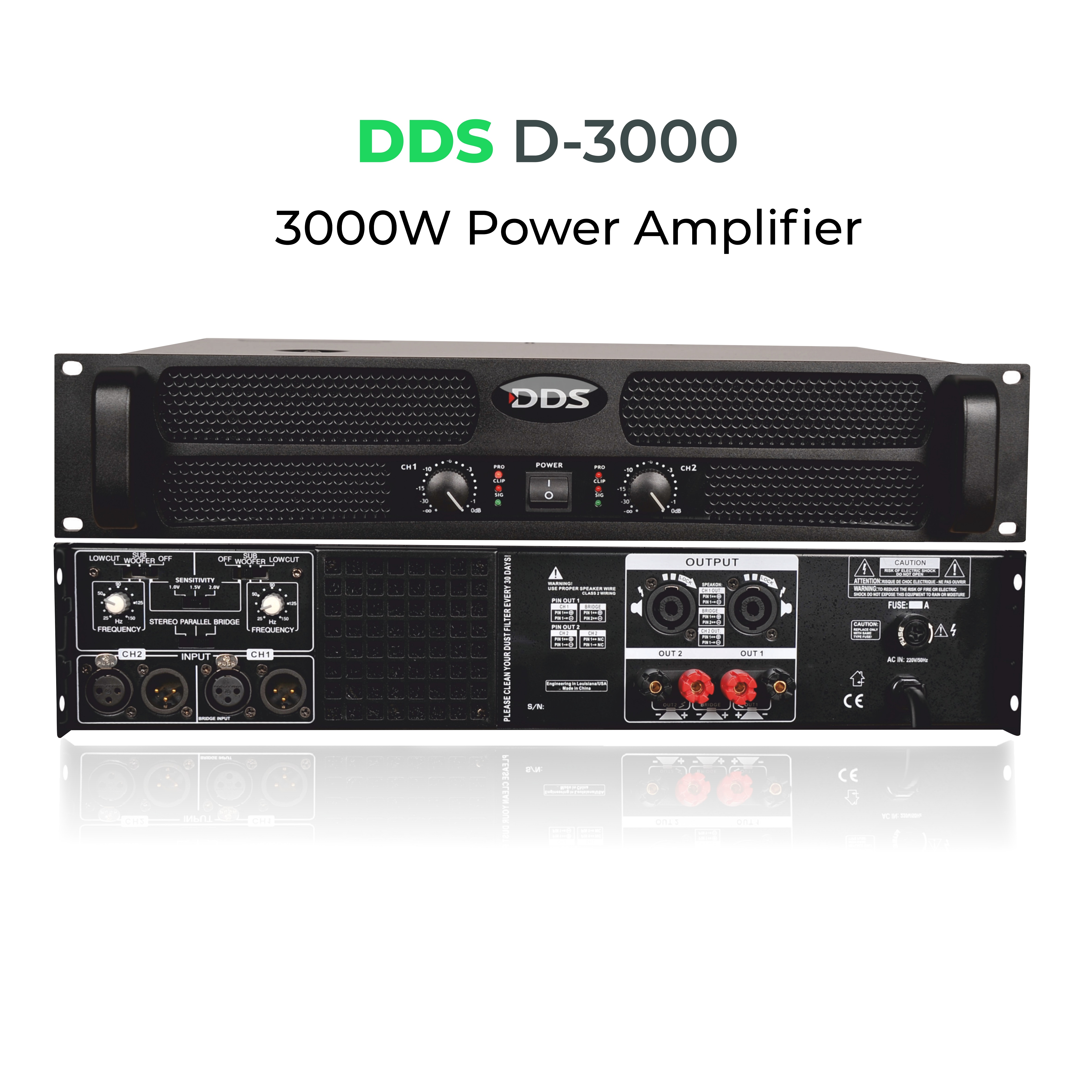 3000 Watt Power Amplifikatör 2 ohm 2x 1500 Watt 4 ohm 2x 800 Watt 8 ohm 2x 500 Watt Bridge (4ohm) : 3000 Watt Ağırlık: 12.5 kg 1 ohm’a kadar çalışabilme HI PASS-LOW PASS FILTRE (CROSSOVER))