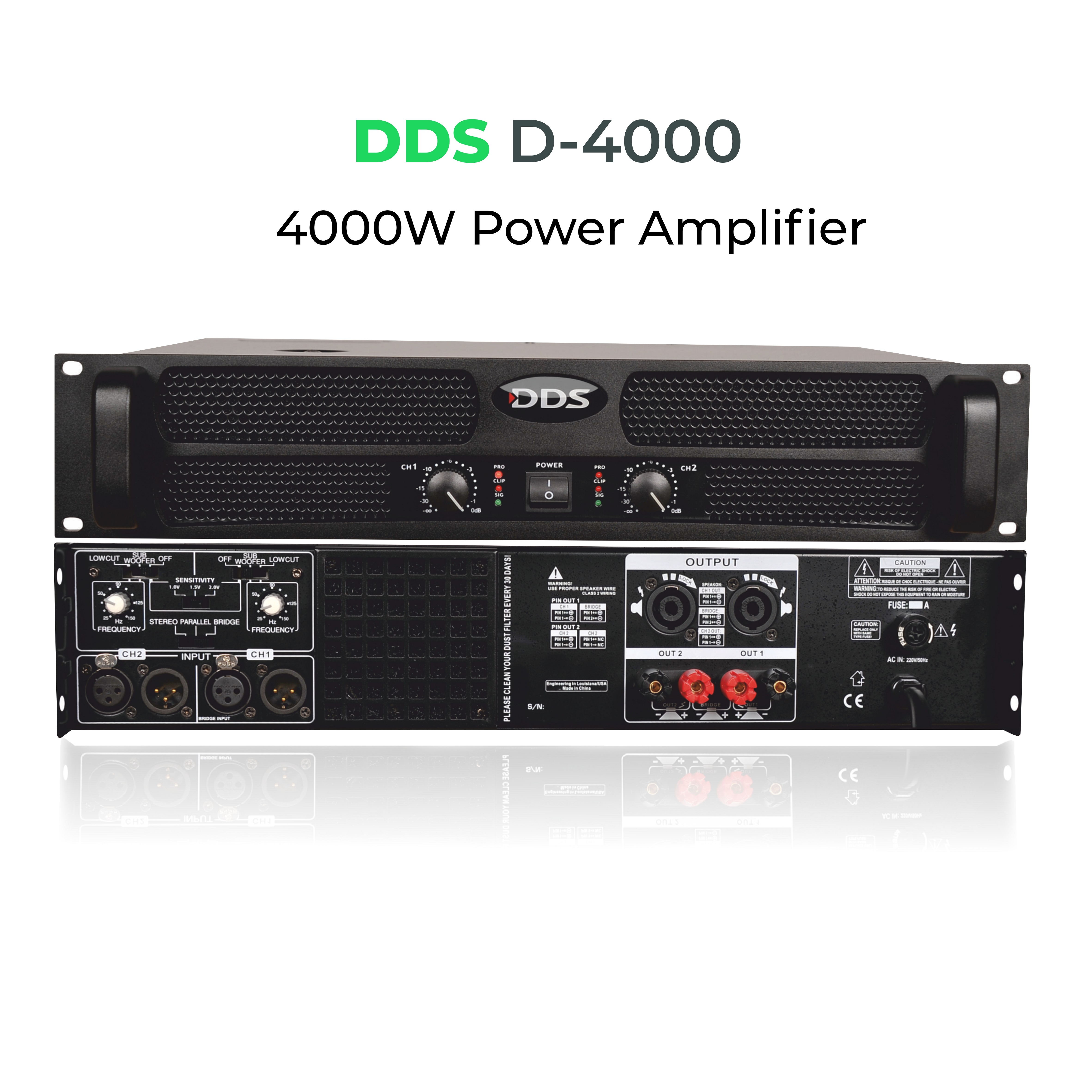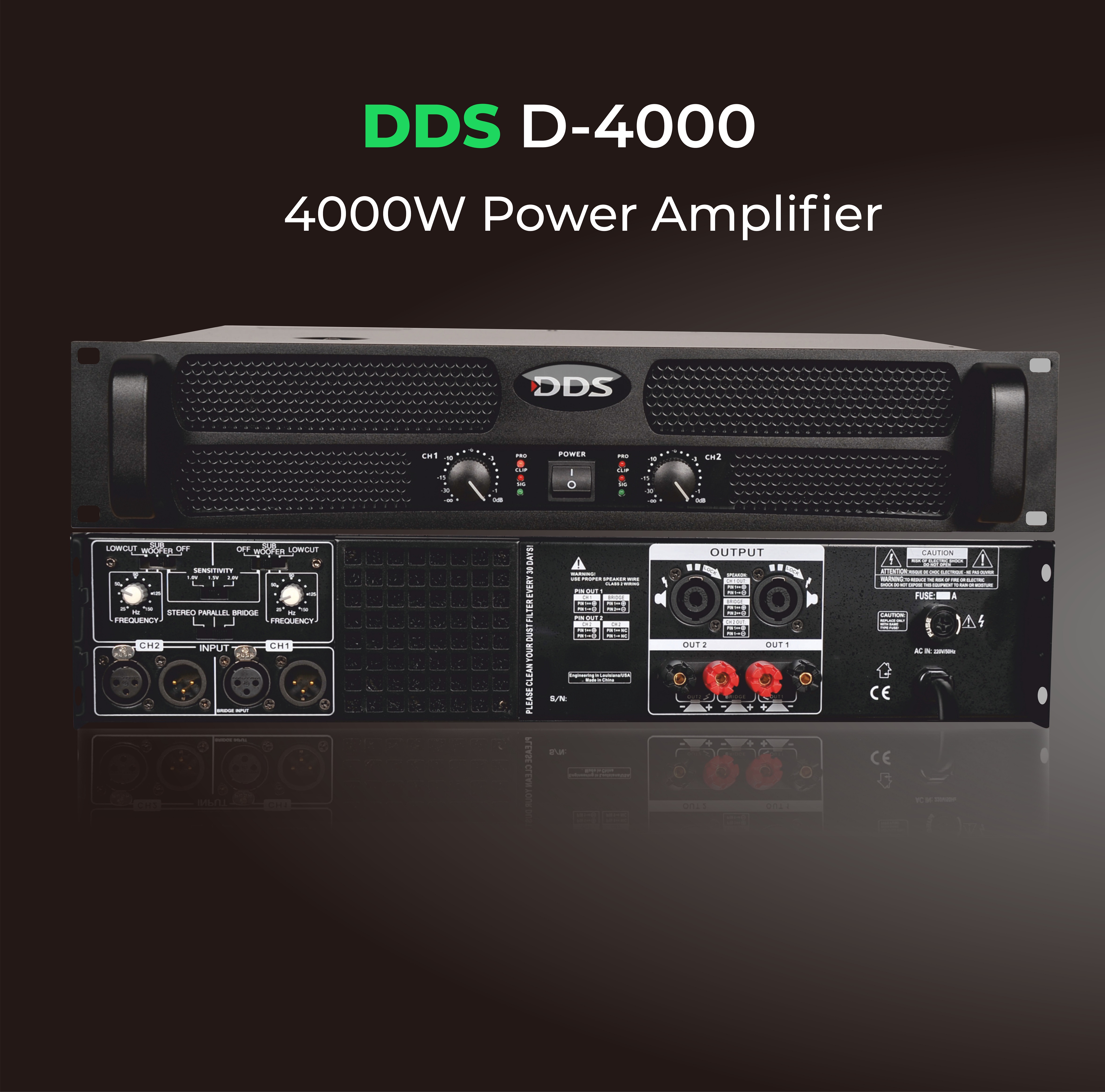 4000 Watt Power Amplifikatör 2 ohm 2x 2000 Watt 4 ohm 2x 1200 Watt 8 ohm 2x 700 Watt Bridge (4ohm) : 4000 Watt Ağırlık: 16 kg 1 ohm’a kadar çalışabilme HI PASS-LOW PASS FILTRE (CROSSOVER)