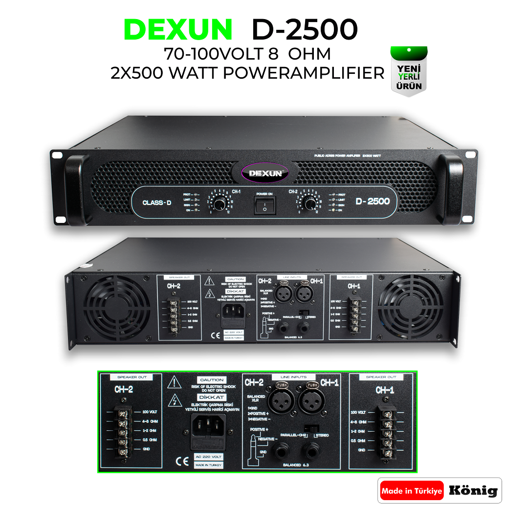 2x500Watt Power Amplifikatör 100V/ 4-8Ohm ,1-2Ohm, 0,5Ohm, GND 70/100 Volt -8 Ohm 2U RACk MOUNT XLR ve 6,3mm Jack Giriş ve Çıkış Yüksek Voltaj ve Kısa Devre Koruma LED Gösterge