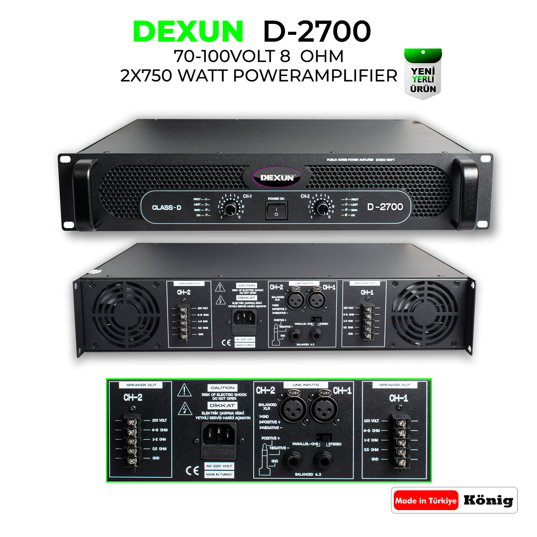 2x750Watt Power Amplifikatör 100V/ 4-8Ohm ,1-2Ohm, 0,5Ohm, GND 70/100 Volt -8 Ohm 2U RACk MOUNT XLR ve 6,3mm Jack Giriş ve Çıkış Yüksek Voltaj ve Kısa Devre Koruma LED Gösterge