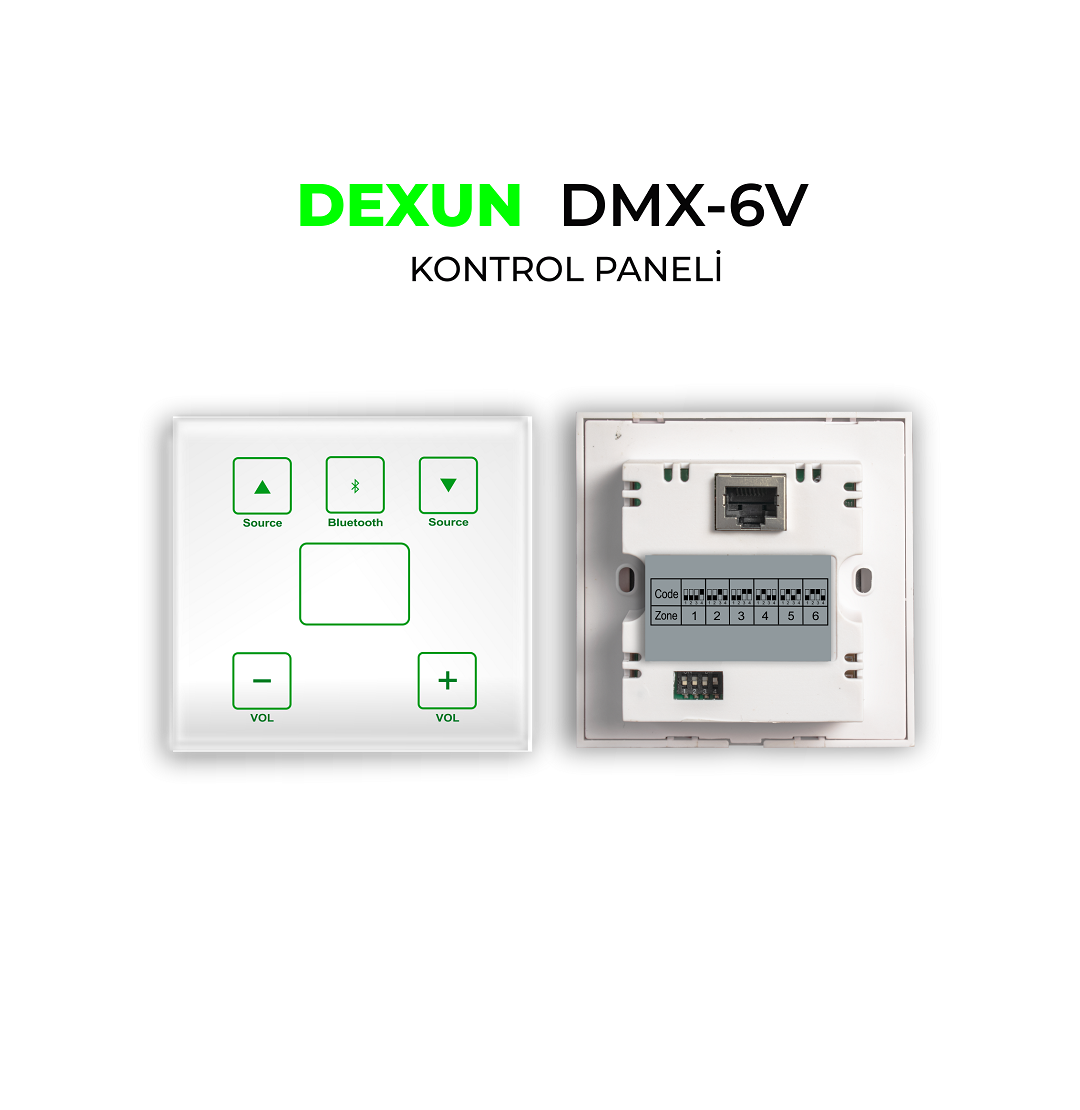 DMX-600 veDMX-900 ile çalışır ki kaynak anahtar anahtarı Bluetooth anahtar tuşu Ses seviyesi- ve ses seviyesi+ tuşu Dijital tüp ekranı Cat 6 Kablo ile Çalışabilme
