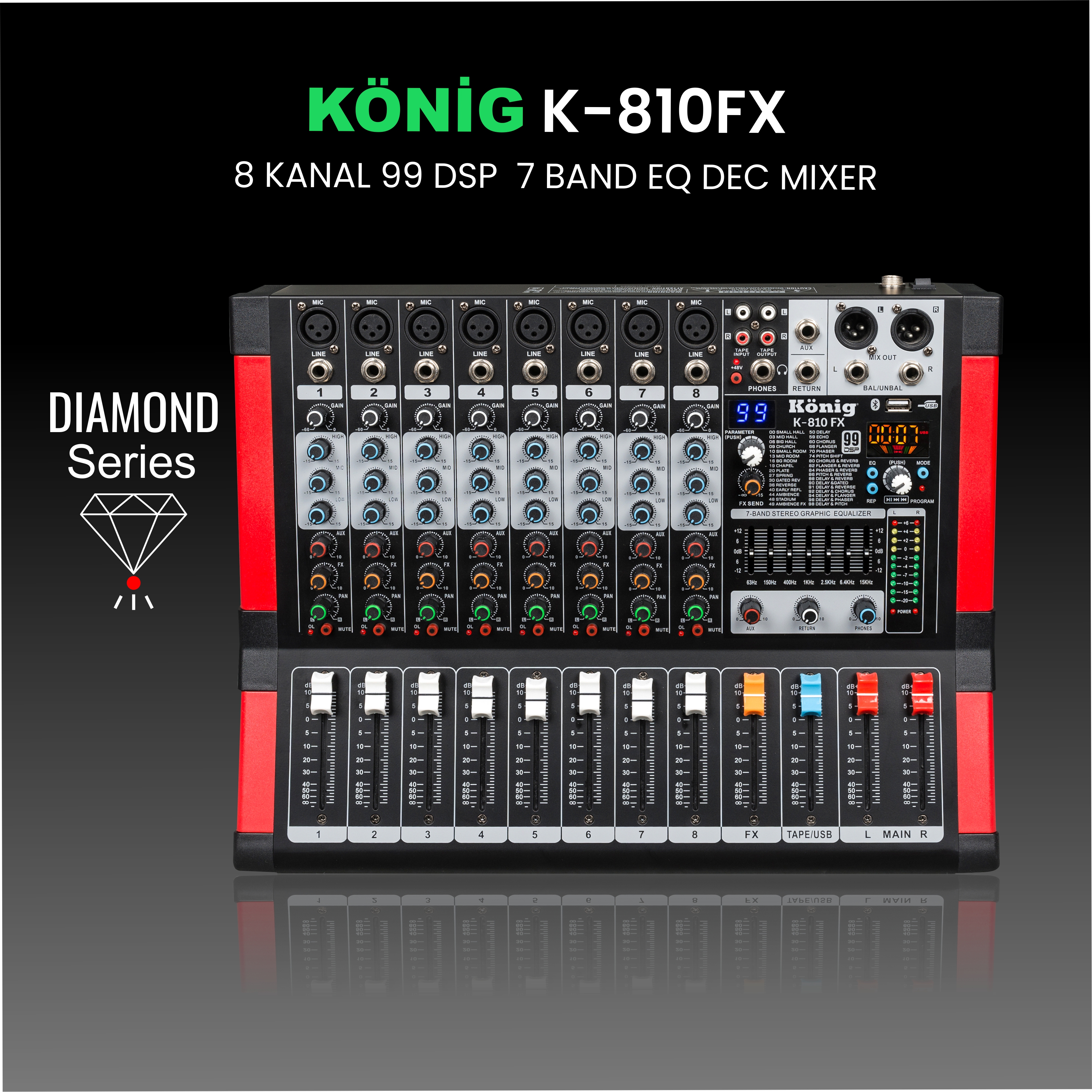 8 Kanal Dec Mixer 8XLR Mono Kanal 1 Aux 3'lü Tonlama 99 DSP Effect 7 Band Equalizer 48V Phantom USB & Bluetooth Her Kanal İçin Mute Fonsiyon