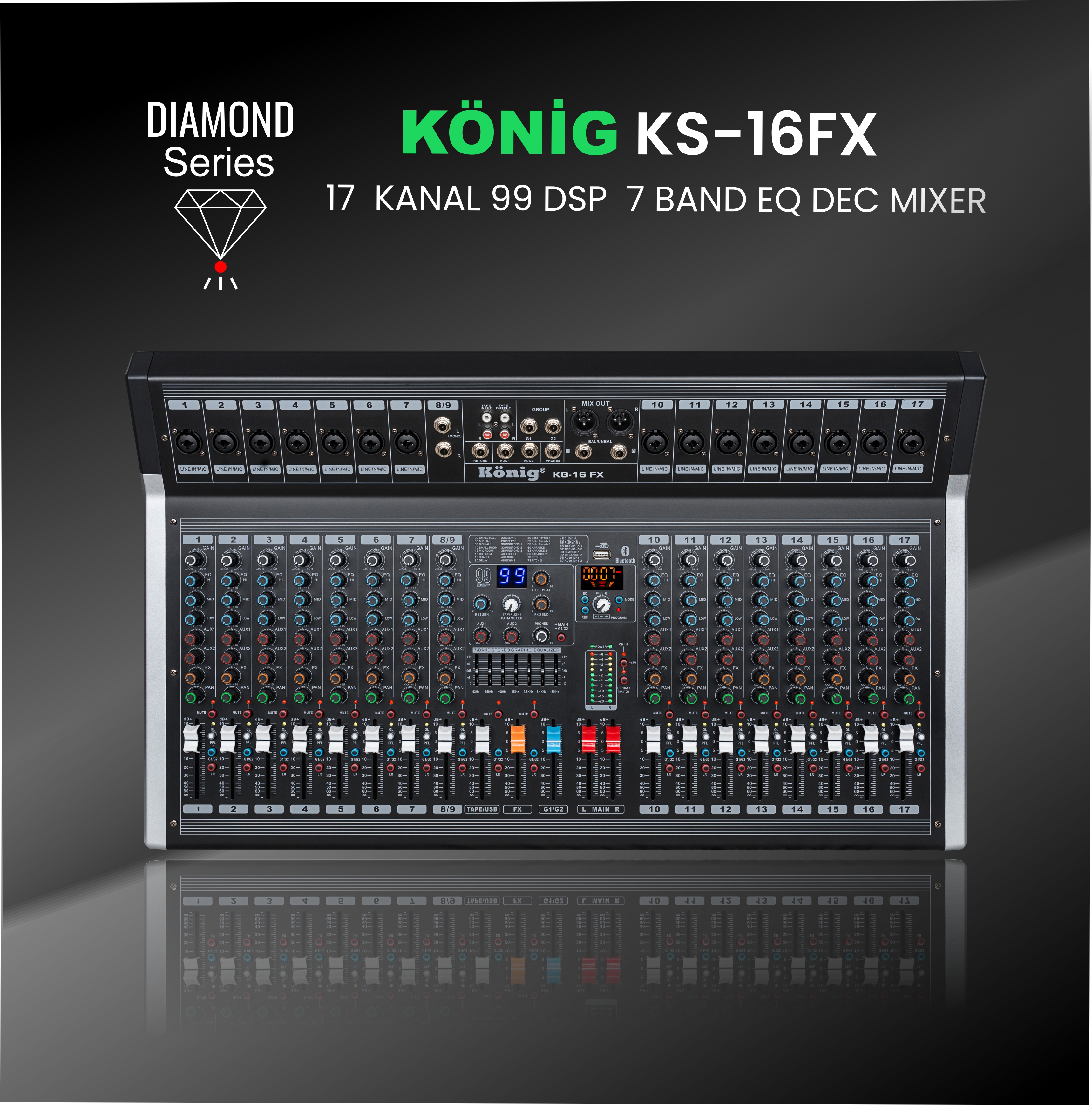 17 Kanal Dec Mixer 15XLR Mono Kanal-1 Stereo Giriş 2 Aux Çıkış & 1 FX 99 DSP Effect 7 Bant Stereo Graphiq EQ 3'lü Tonlama USB Bluetooth & Kayıt 48V Phantom Her Kanalda Mute Fonksiyon 2Grup Main Output Kontrol