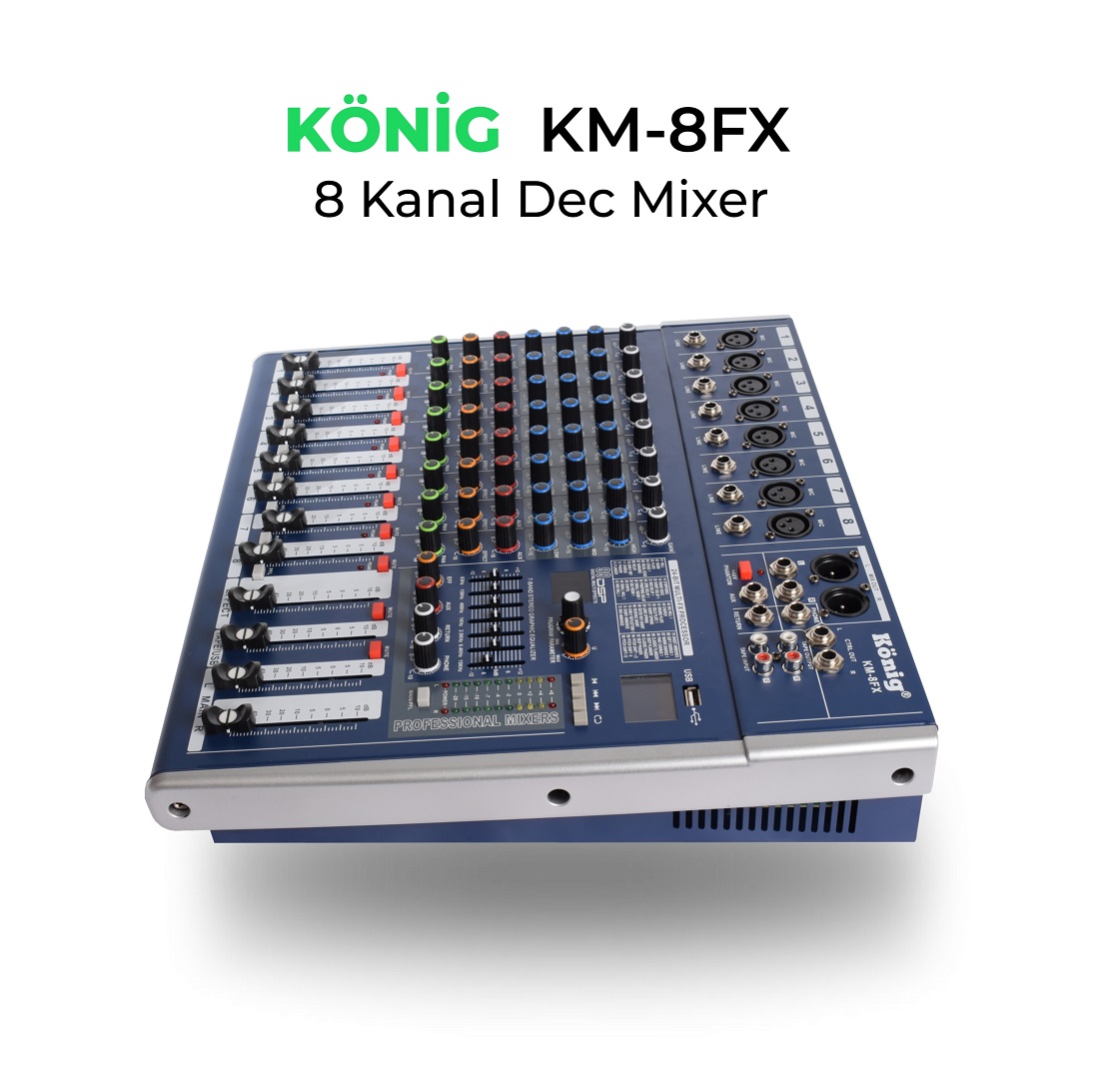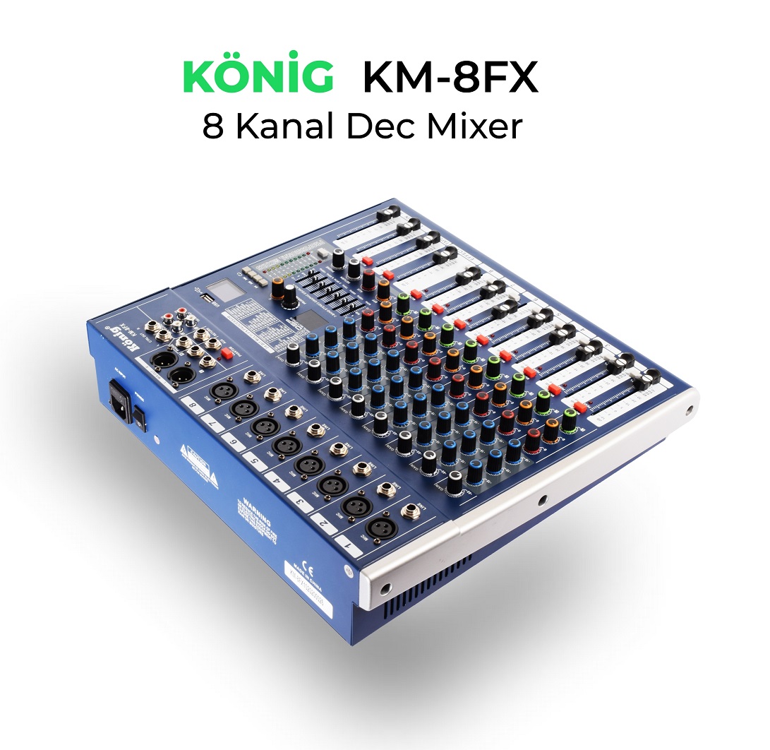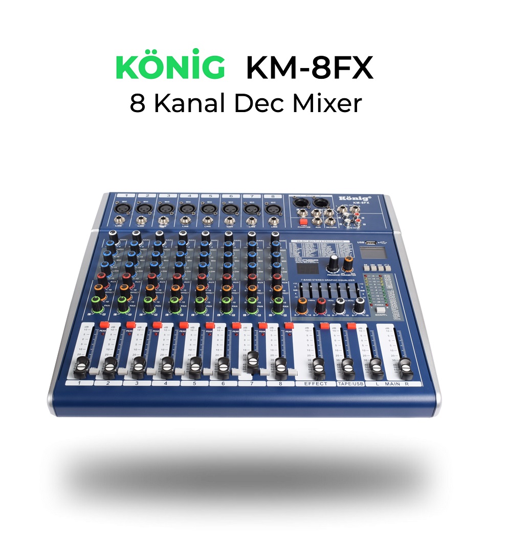 8 Kanal Dec Mixer 8 XLR /Line ( Mono Giriş ) USB Kayıt Bluetooth USB/SD/DISK 99 DSP Effect 48V Phantom/ İsteğe Bağlı Mp3 Recording 7 Band Equalizer Rack Montaj Aparatı