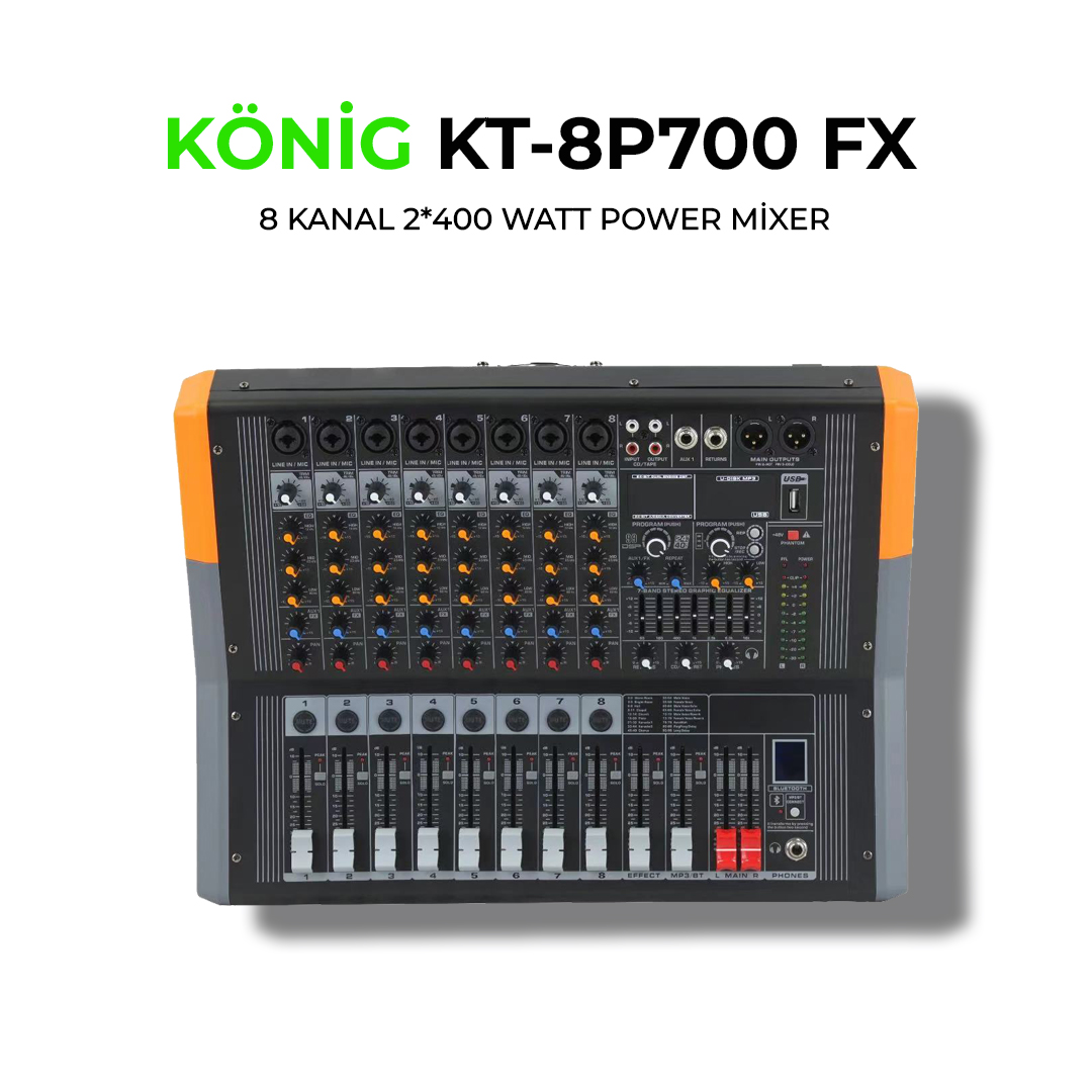 8 Kanal Power Mixer 800Watt 2x400 W 8 Mono Giriş 1 Aux 99 Dsp Dijtal Efect 7 Band Ekoleyzer 3'lü Tonlama USB & Bluetooth Her Kanalda Mute tuşu +48v Phantom